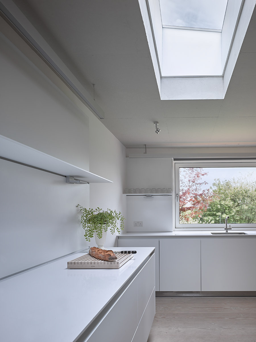 This new build home in the picturesque village of Orford utilises a palette of natural and traditional materials to blend with the rural street scene. A home for a silversmith and a baker; the property enables light, airy, open plan living – whilst still providing adequate workshop and office space. Externally, the ground floor benefits from local handmade bricks laid in lime mortar, whilst ribbons of lightweight oak cladding wrap around the first floor element and across the pitched roof. Internally, the exposed concrete soffit adds industrial style, which is offset by the warmth of the whitewashed wide douglas fir planks.